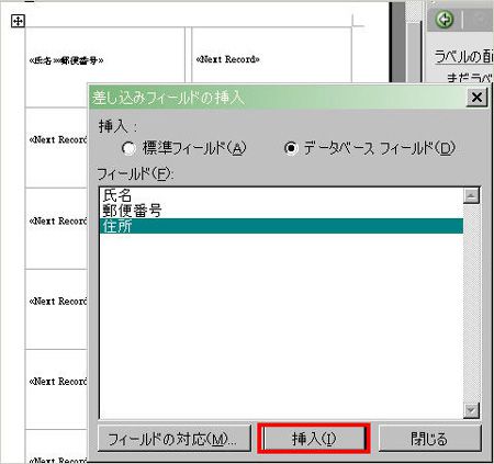(12) ラベル項目をサンプル画面にレイアウトして、郵便番号や住所などをレイアウトします。「OK」ボタンをクリックします。差し込みたいフィルードを順番に選択し、挿入ボタンを押します。すべて挿入し終わったら、画面を閉じます。