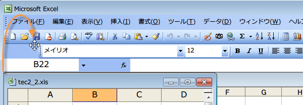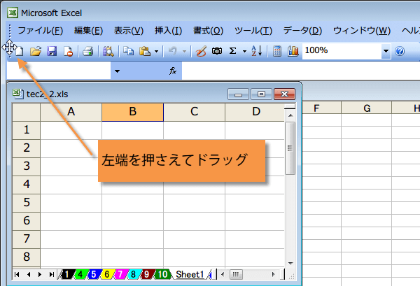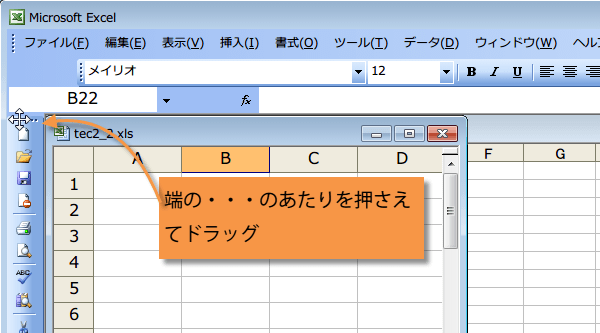 (2)行番号の左側までドラッグすると、ツール バーも移動するので、そこでマウス ボタンを離します。
