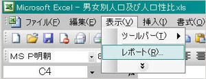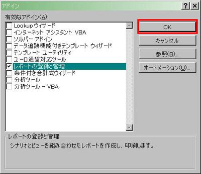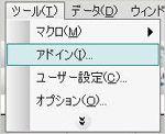 (1)メニューの「ツール」→「アドイン」を選択します。「アドイン」画面で「レポートの登録と管理」にチェックして「OK」ボタンをクリックします。