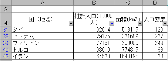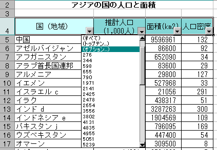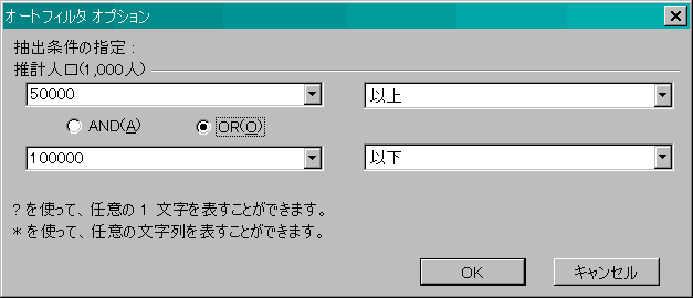 この表から、「推定人口」が「50000」から「100000」のデータを表示させて