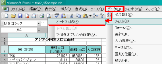 (2)データメニュー:[フィルタ]:[オートフィルタ]を選択します。