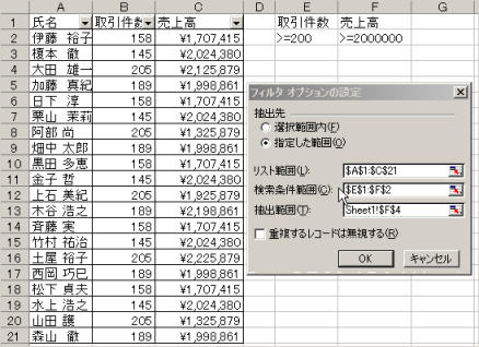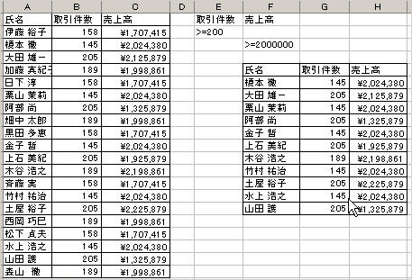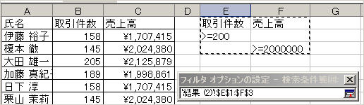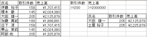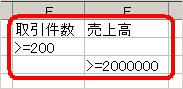 ここでは「取引件数が200以上」かつ「売上高が20000000以上」のデータを抽出するという条件を入力しました。