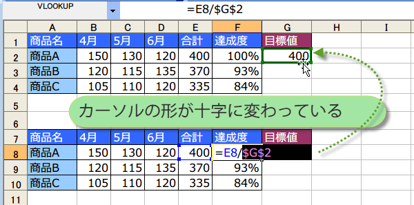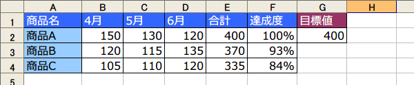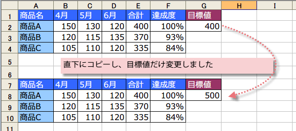 目標値が絶対参照になっていたので、コピーした先の式が参照しているのは、コピー元の目標値なのですね。