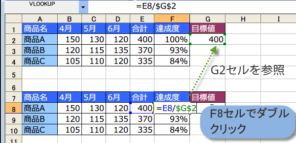 目標値を変えたのに、F8セルの達成度が100%になってます。