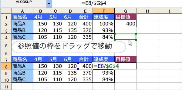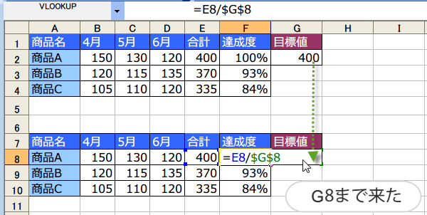それで、新しい目標値のセルG8までもって行きます。(ドロップ)