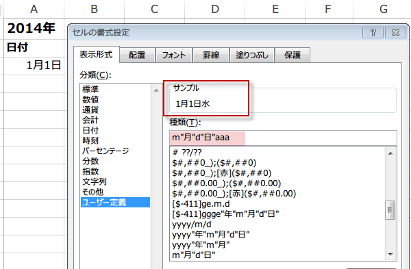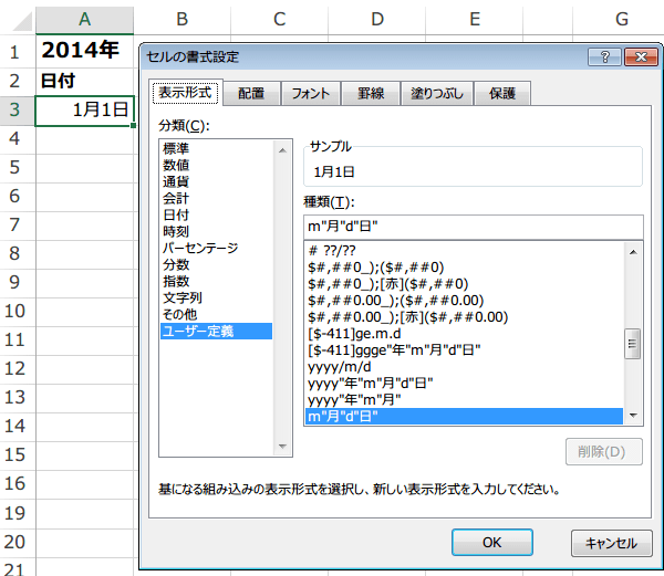 そこに、「m"月"d"日" aaa」と入力し、