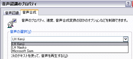 (4)すると、「音声認識のプロパティ」が表示されます。この中から、男性の声がよければ「Kenji」、女性の声がよければ「Naoko」を選択して「OK」ボタンをクリックします。