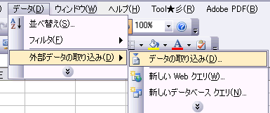 メニューバーの「データ(D)」から「外部データの取り込み(D)」の中の「データの取り込み(D)」を選択します。