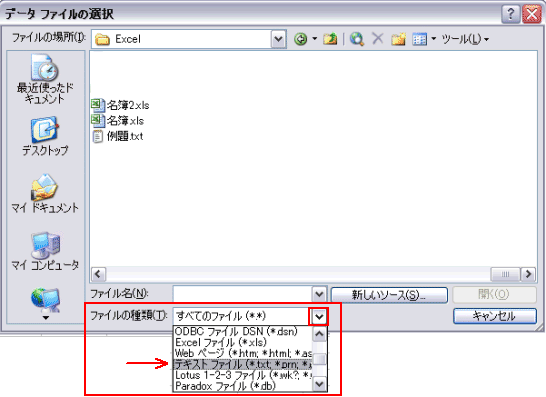 「ファイルの種類(T)」の右側の矢印をクリックし、「テキストファイル」を選びます。