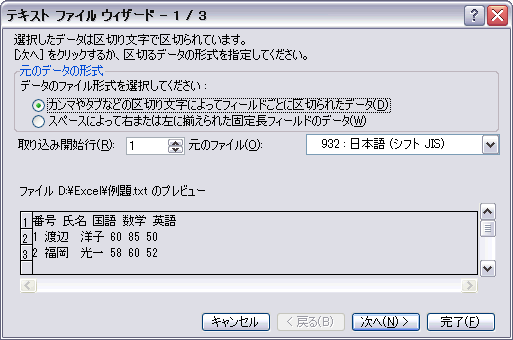 (4)「テキストファイル ウィザード」の1/3が開きます。