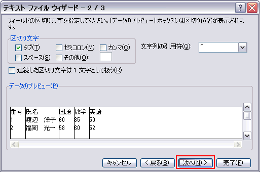 「データのプレビュー(P)」で区切り位置があっているかを確認しながら作業を進められます。