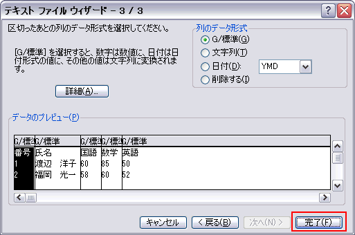 「データのプレビュー(P)」でそれぞれの列の形式があっているかを確認し、「完了(F)」ボタンをクリックします。