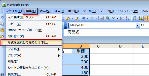 メニューバーの「編集」から「形式を選択して貼り付け」をクリックして、