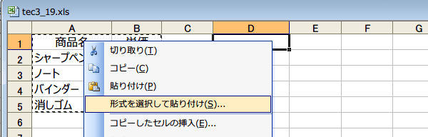 右クリックのショートカットメニューから 「形式を選択して貼り付け」を選択します。