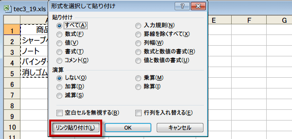 (7)形式を選択して貼り付けダイアログの下にあるリンク貼り付けをクリックします。