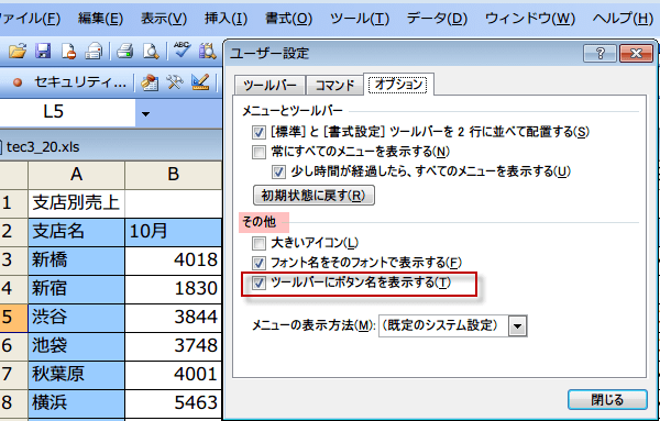 ユーザー設定ダイアログボックスが表示されますから、オプションタブをクリックします。その他 の項目にある
