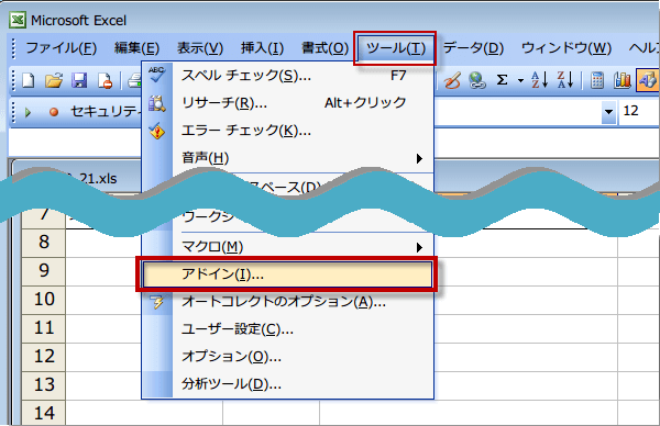 メニューのツールから、アドインを選択します。