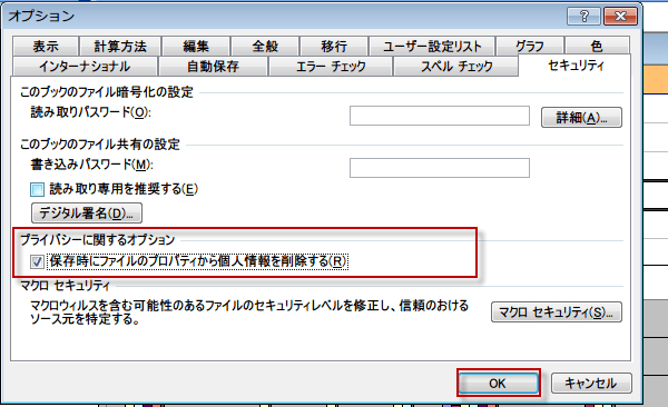 「このファイルに保存された個人情報を削除する(R)」のチェックボックスにチェックを入れてます。