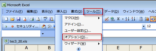 1.「ツール(T)」メニューから「オプション(O)...をクリック。
