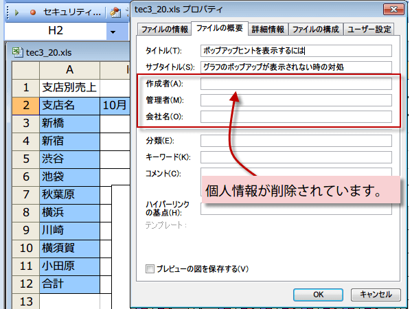 そして、このブックを保存すると、プロパティに含まれる個人情報などが削除されます。