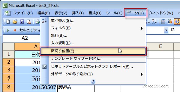 (2)メニューから、[データ]−[区切り位置] をクリック