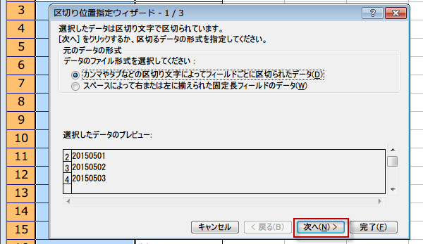 (3)区切り位置指定ウィザード(1/3)が起動します。