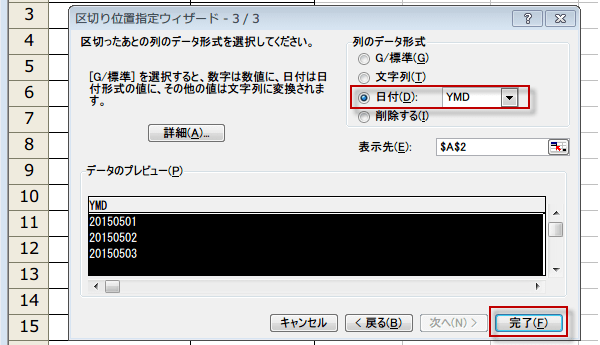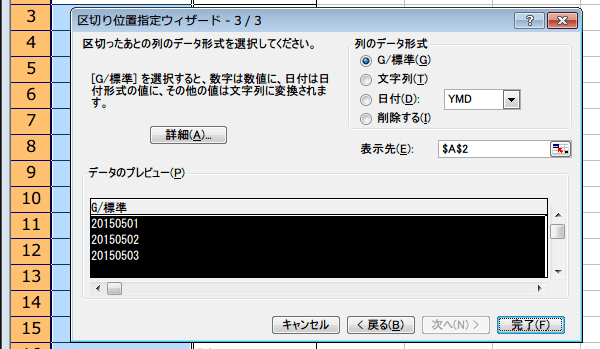 (4)区切り位置ウィザード3/3のダイアログにきたら、その列の表示形式を