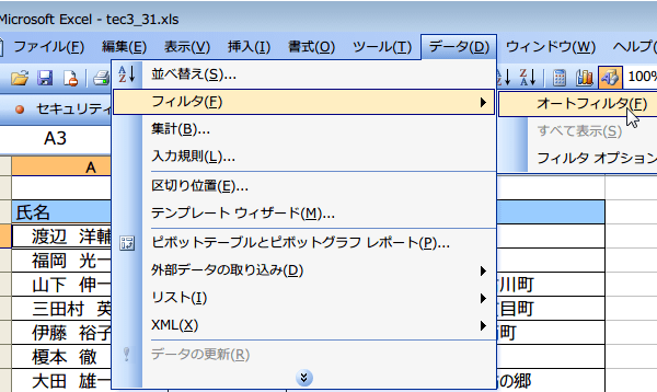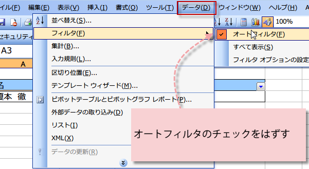 (2)メニューの[データ]→[フィルタ]→[オートフィルタ]を選択します。