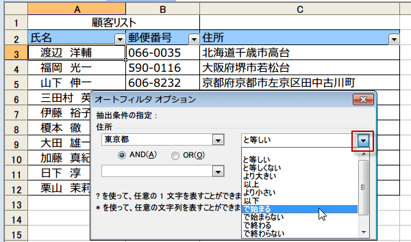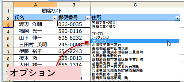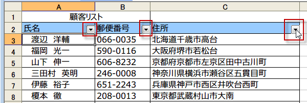 (3)ここでは住所で抽出したいので、「住所」の▼をクリックします。