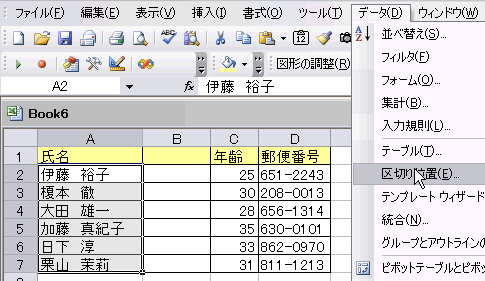 メニューから「データ」をクリックしし、つづいて[区切り位置」を選択します。
