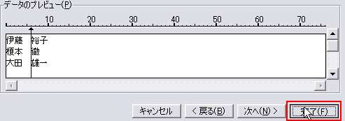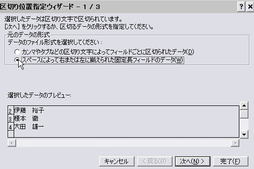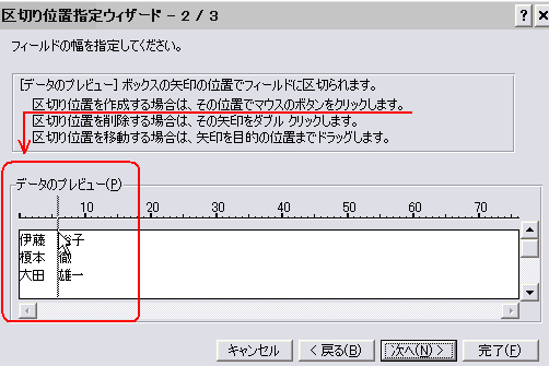 すると、上図のように、区切り位置指定ウィザードが起動します。
