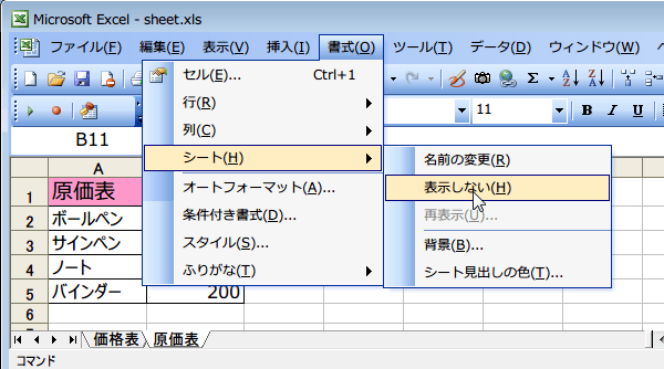 [書式]メニューの[シート]の[表示しない]を選びます。