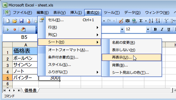 非表示にしたシートを再び表示させるには、