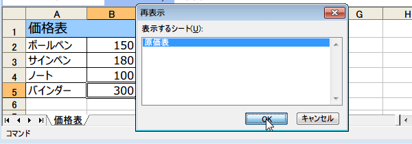 (2)これだけで、「原価表」シートが非表示になりました。