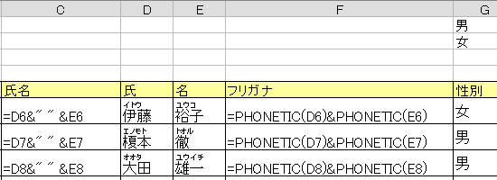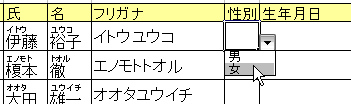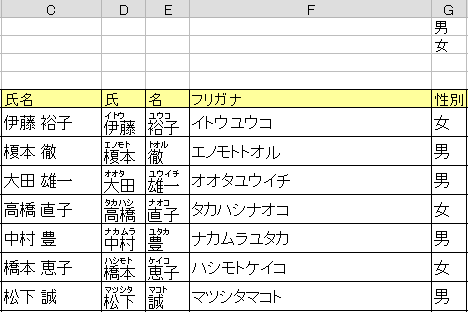 そして、F列はカタカナのフリガナが表示され、G列は性別です。