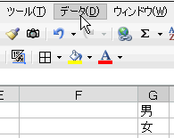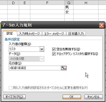 G列の性別は、入力規制です。あらかじめ、選択肢となる値を入力しておきます。