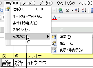 【利用方法】メニューの [書式]を選択し、[フリガナ]とたどり、[表示/非表示]をクリック。