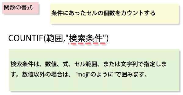 指定した範囲内で検索条件に一致したセルの個数を求める(返す)関数です。