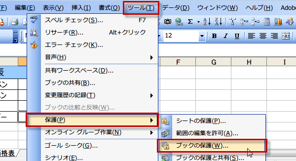 (1)メニューの『ツール』から、『保護』を選択、続いて『ブックの保護』を選びます。