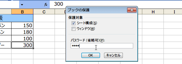 『シート構成』チェックボックスにチェックを入れ、パスワードを設定します。