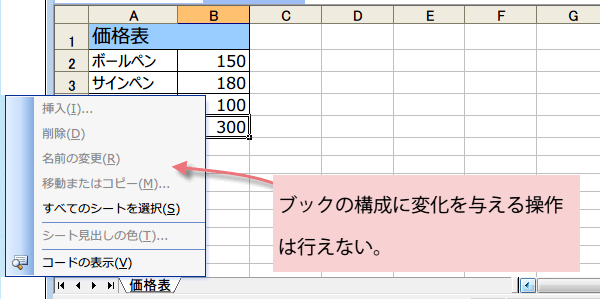 『ブックの保護』コマンドを使って前回利用した、価格表と原価表の2つのシートがあるブックのシート構成を保護することにします。