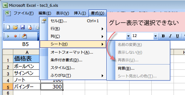 (2)非表示にしたシートを再び表示させる手順をやってみましょう。