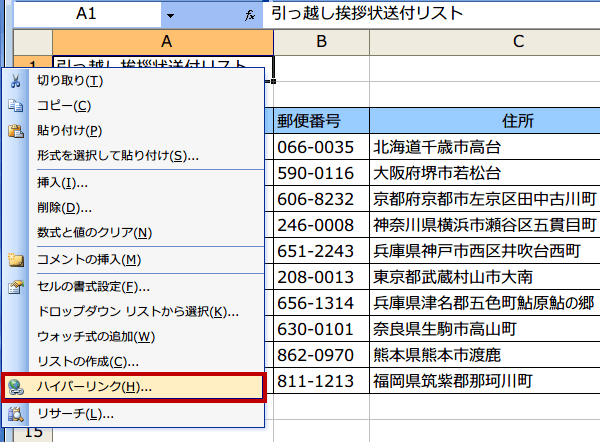 右クリックメニューから「ハイパーリンク(H)」を選択します。
