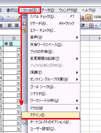 [ツール(T)]メニューから[アドイン(I)...]を選択ます。