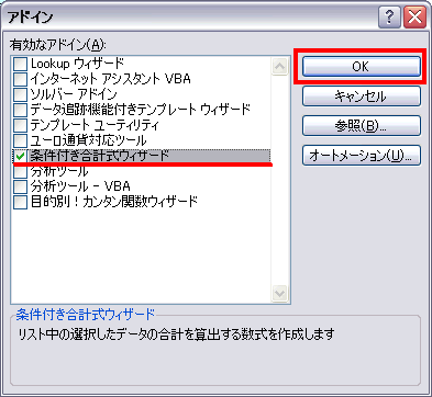 表示された[アドイン]ダイアログで[条件付き合計式ウィザード]のチェックボックスをオンにして、[OK]ボタンをクリックします。これで、「条件付き合計式ウィザード」が使えるようになります。