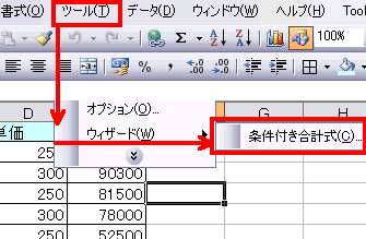 (2)[ツール(T)]メニューの[ウィザード(W)]を選択し、つづいて、[条件付き合計式(C)...]を選択し、条件付き合計式ウィザードを起動します。