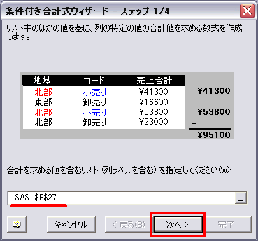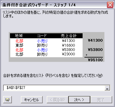 (3)条件付き合計式ウィザード-ステップ1/4が表示されます。