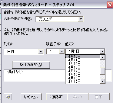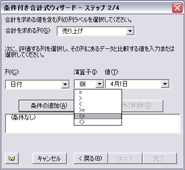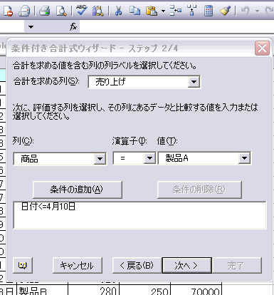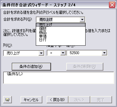 [条件付き合計式ウィザード-ステップ2/4]で、合計を求める値がある列、を選択します。▼で列ラベルが選択できます。