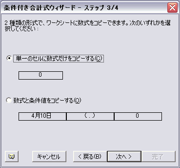 [条件付き合計式ウィザード-ステップ3/4]で、[単一のセルに数式だけをコピーする(C)]が選択されていることを確認し、