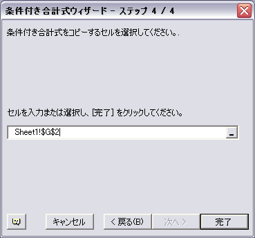 [条件付き合計式ウィザード-ステップ4/4]で、この合計を表示したいセルをクリックで指定します。